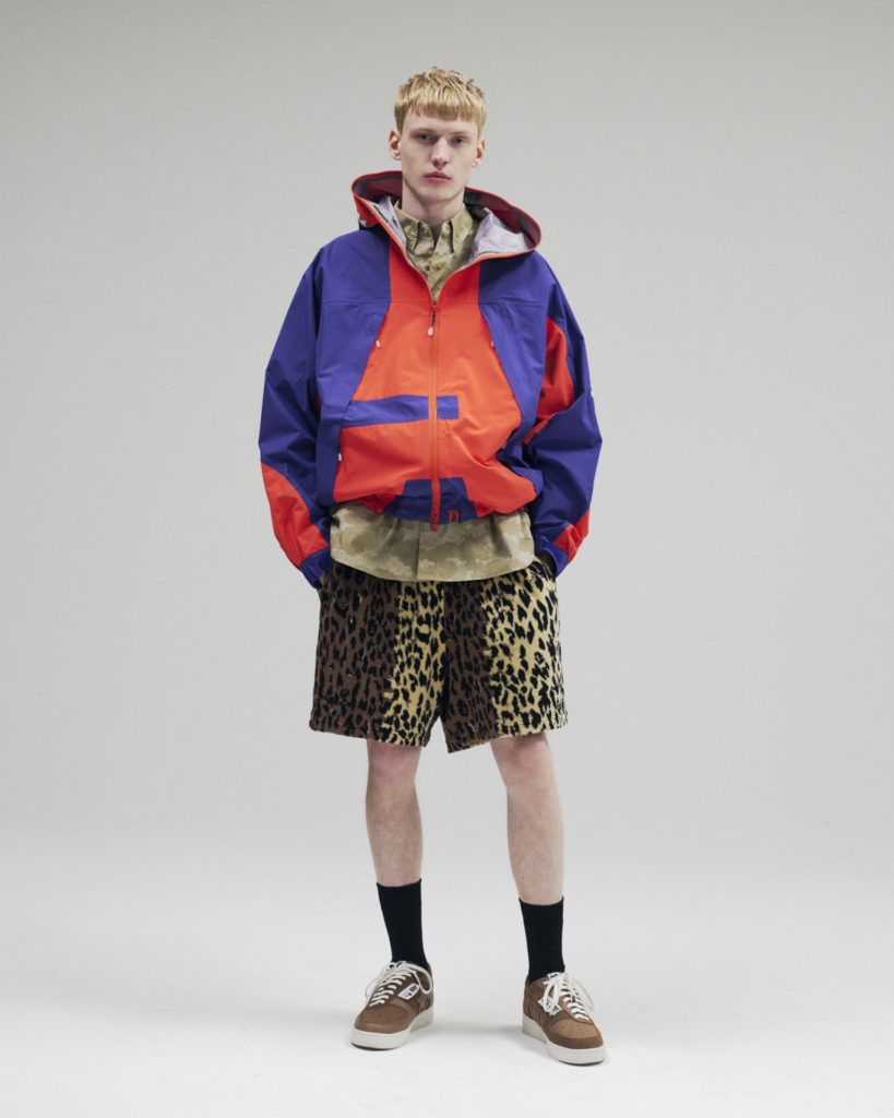 K「今シーズンは長袖のジャケットやカットソーにショーツを合わせるコーディネイトが特徴です。クラシックな雰囲気だけど素材感やシルエットは現代的というのが気分。BAPEらしいストリートな表情を意識しています。カモフラージュ柄やシャーク仕様などのBAPE特有のディテールを少しアレンジしたデザインもインラインとは異なるポイント。ジャケットにはラミネート加工を施している生地を使用したものもあって、これはもちろん雨も防げるのでスキー場でも、普通に街着としても使えます。薄手の生地感も春夏シーズンらしいと思います」