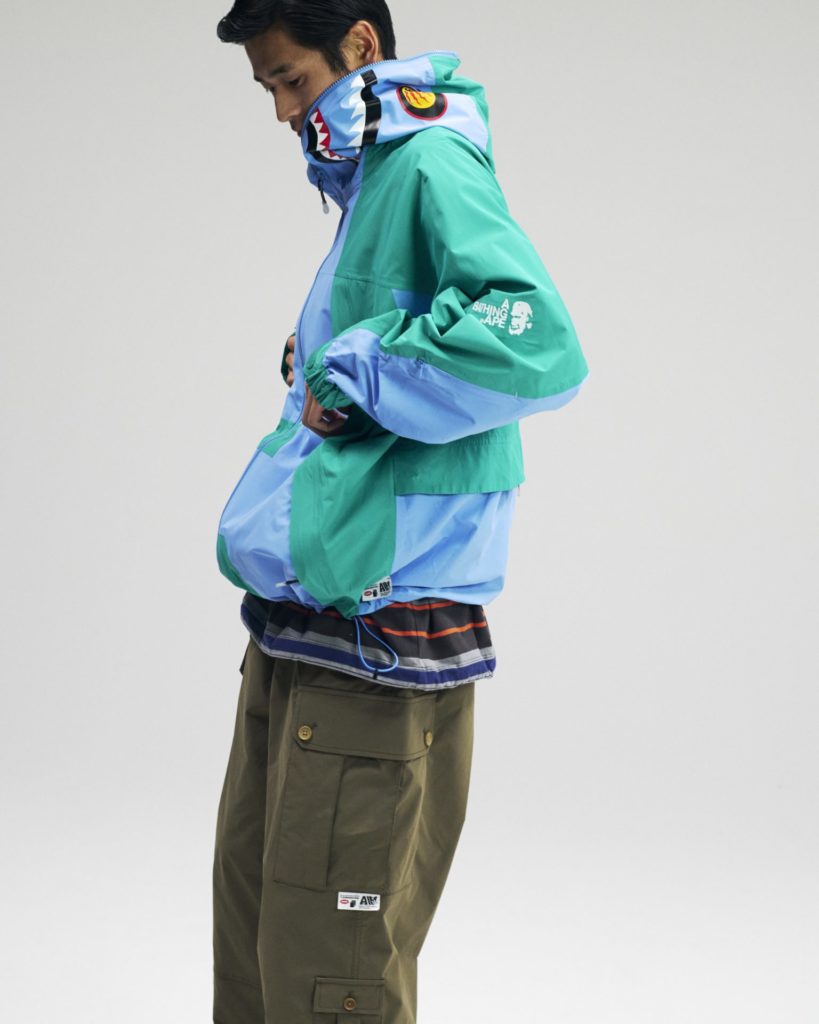 K「次の秋冬シーズンはスノーボード想定のプロダクトに加えて、街で着られるアウトドア要素の強いものを展開します。街からキャンプ、街からフェス、そして街からスノーアクティビティという流れをフォローできる。それが僕とBAPEが目指すプロダクトの方向性。デザインにこだわった分、機能面がおろそかになる。それでは意味がない。昨今“機能美”といわれるものは削ぎ落としたソリッドなものと捉えられがちですが、歴史を積み上げた存在感のあるアイコニックな機能美というものがあってもいい。特にアウトドアシーンを想定した場合、その考え方は個性にもつながる。BAPEしかできない次のステップに僕個人としても興味がつきません」