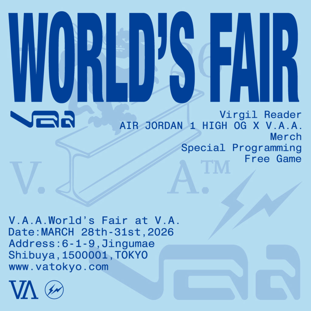 先日発表された「VIRGIL ABLOH ARCHIVE™️(ヴァージル・アブロー・アーカイブ)」と「ジョーダン ブランド」による、故ヴァージル・アブロー氏(1980–2021)オリジナルデザインのV.A.A.エディション「AIR JORDAN 1 HIGH OG X V.A.A.」のローンチを記念して、「V.A.」にて「V.A.A.™️ WORLD’S FAIR」を開催する。